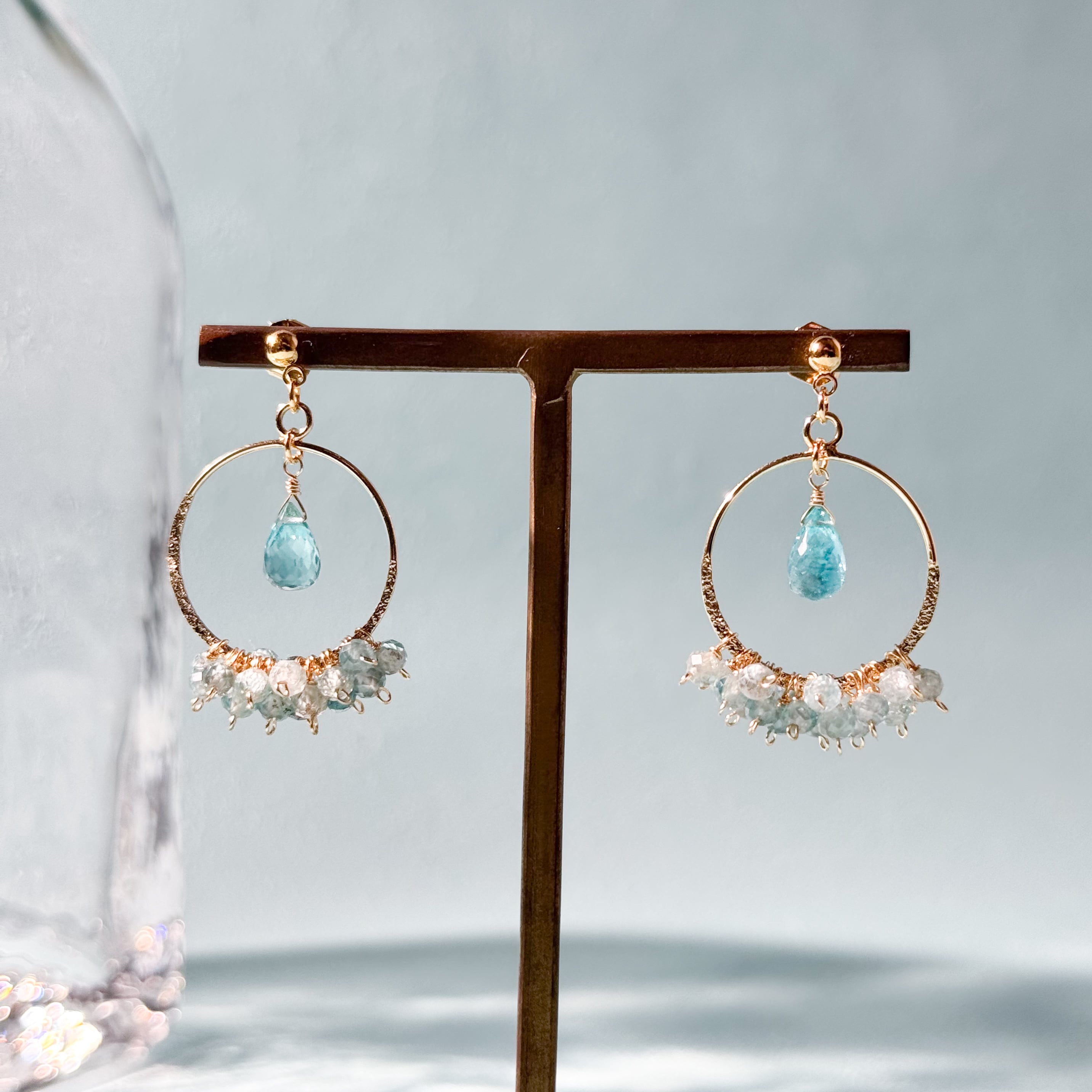 メタルフープの内側には、ボタンカットのブルージルコンを絨毯のようにたっぷりとあしらい、やわらかく広がる青の景色を表現しました。中央で揺れるドロップカットのアパタイトが、陽の光を受けてきらめく花畑の空気を思わせます。