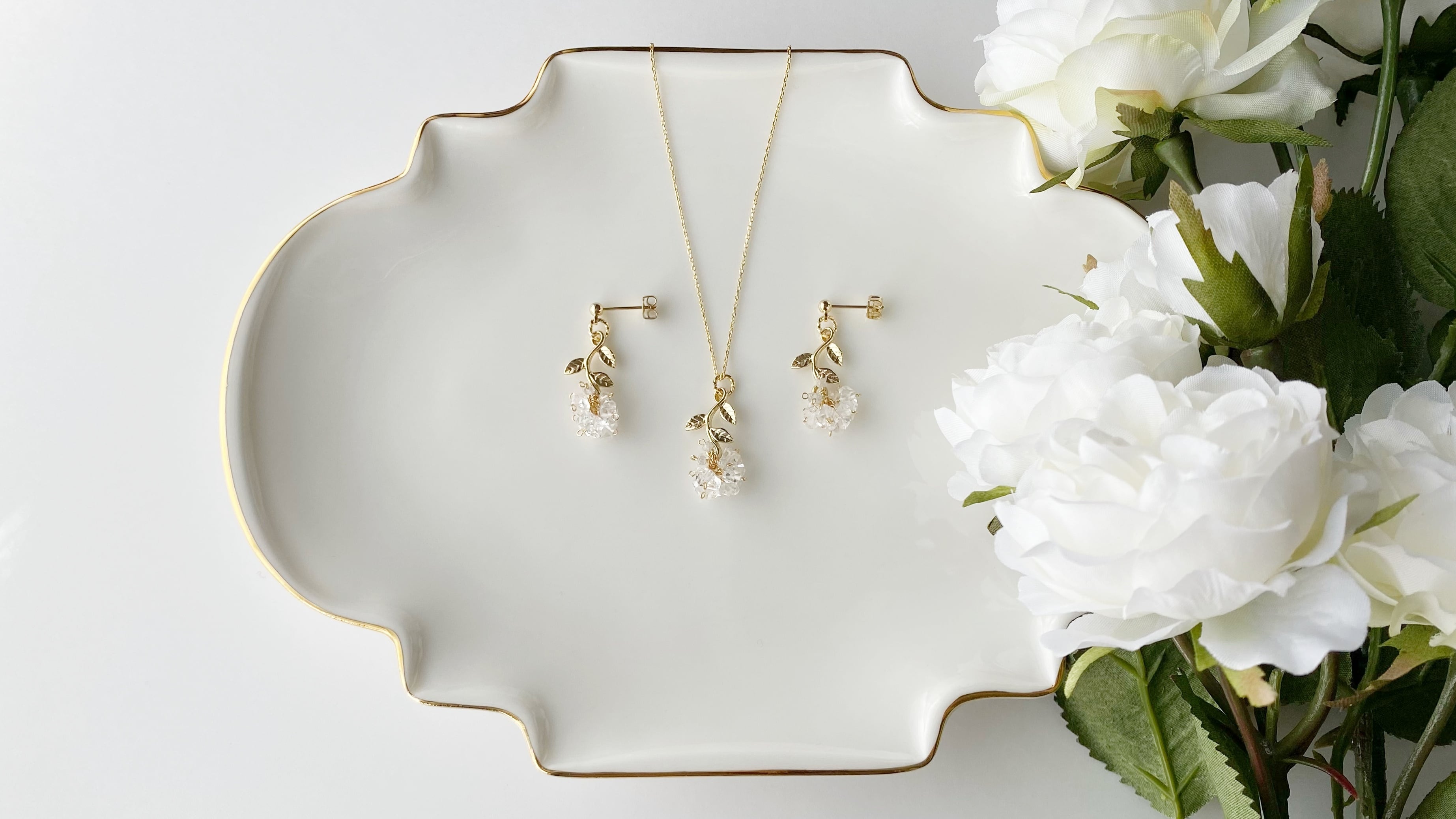 「花の女王」とも称される白薔薇と、4月の誕生石ダイヤモンドを組み合わせたアクセサリーです。