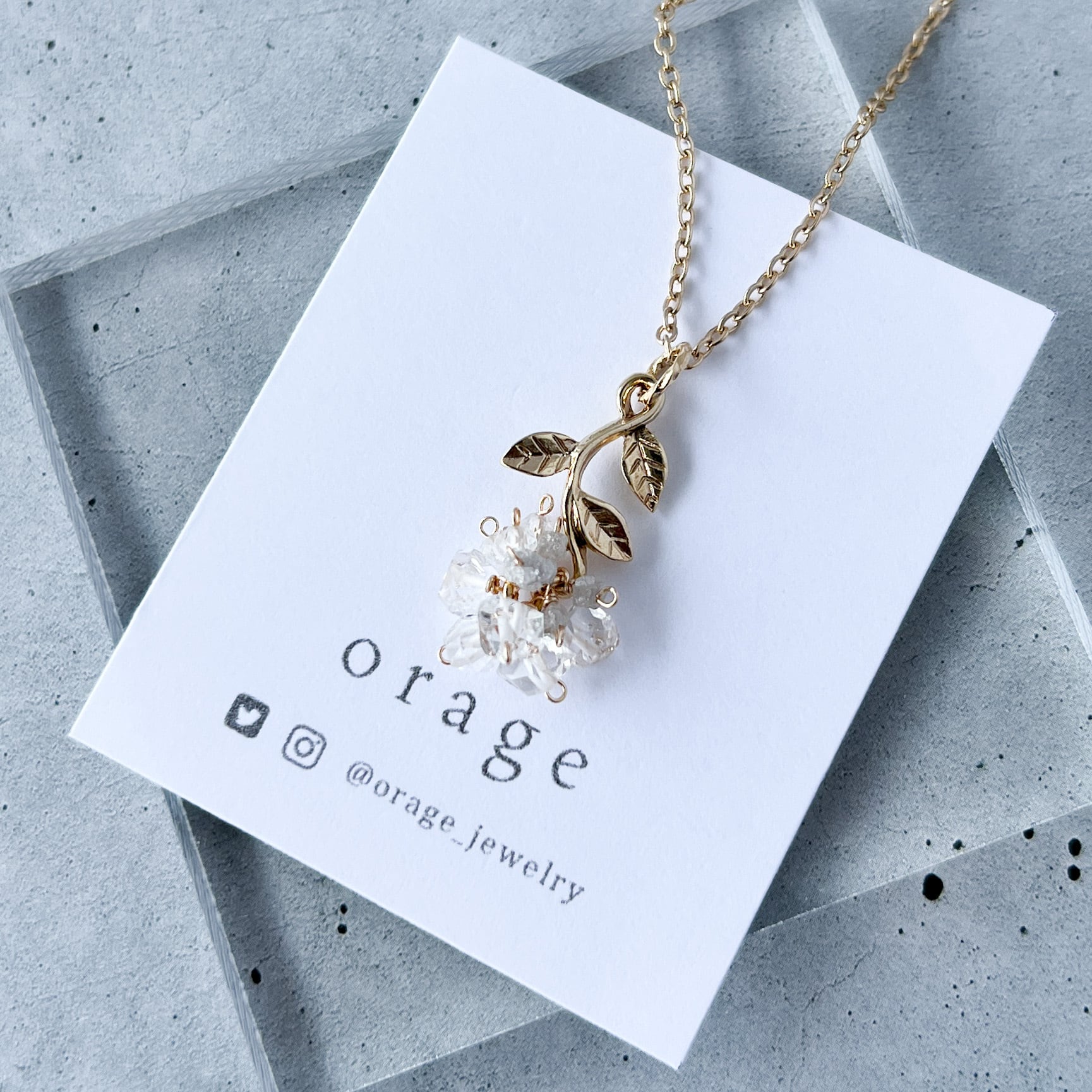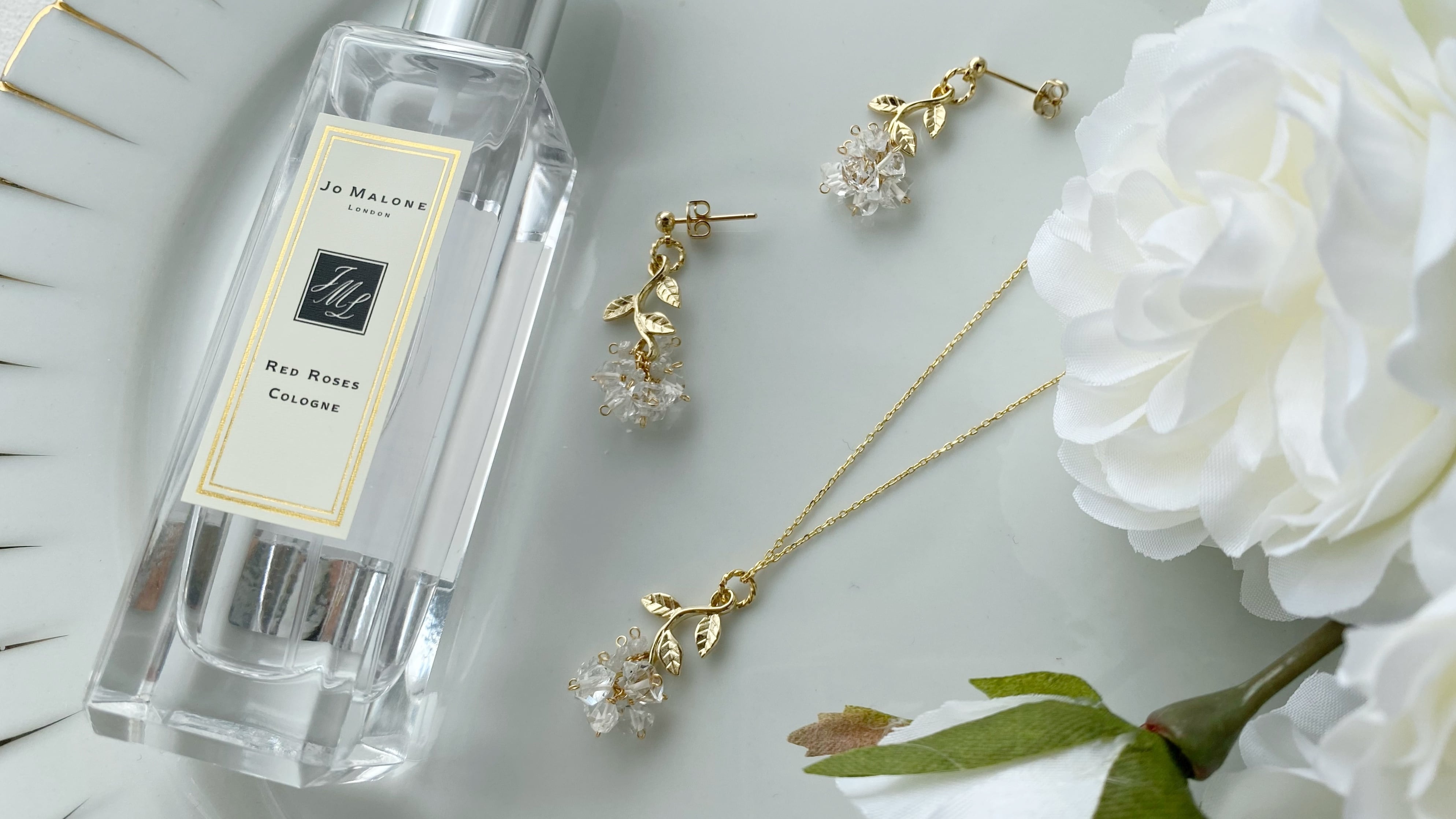 そして高い透明度と力強い輝きをもつハーキマーダイヤモンド(水晶)を組み合わせ、白薔薇の花に見立てて仕立てました。